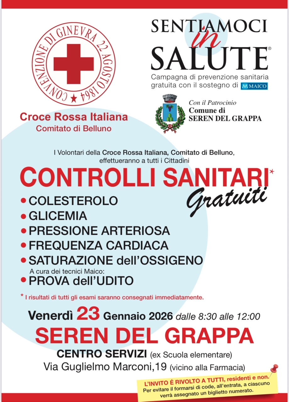 La Croce Rossa Italiana - Comitato di Belluno con il patrocinio del Comune di Seren del Grappa presenta Sentiamoci in Salute, un progetto di prevenzione sanitaria gratuita con il sostegno di Maico.